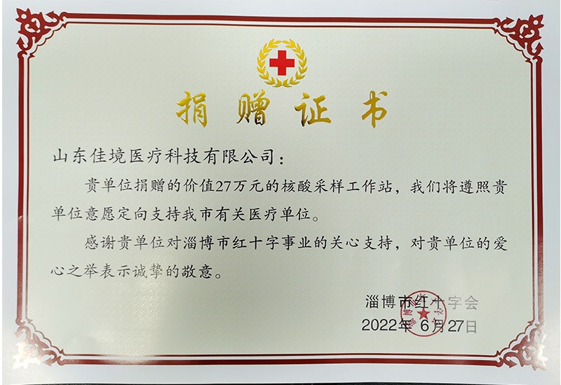 6月27日下午,山東佳境醫(yī)療科技有限公司向淄博市紅十字會(huì)捐贈(zèng)用于抗擊新冠病毒的核酸采樣工作站11臺,總價(jià)值27萬元,支援我市疫情的防控工作。淄博市紅十字會(huì)二級調(diào)研員劉永鋒、佳境醫(yī)療董事長鐘文泉先生出席捐贈(zèng)活動(dòng)。劉永鋒表示:“非常感謝佳境醫(yī)療的無私捐贈(zèng),這是一次積極向上、回報(bào)社會(huì)的愛心行動(dòng),對廣大企業(yè)積極參與抗擊疫情、履行社會(huì)責(zé)任將起到示范作用。鐘文泉表示:“臨近七一建黨節(jié),作為一名黨員,一定要響應(yīng)黨和政府的號召,盡自己的綿薄之力,向所有抗疫一線的醫(yī)護(hù)人員表示敬意”。